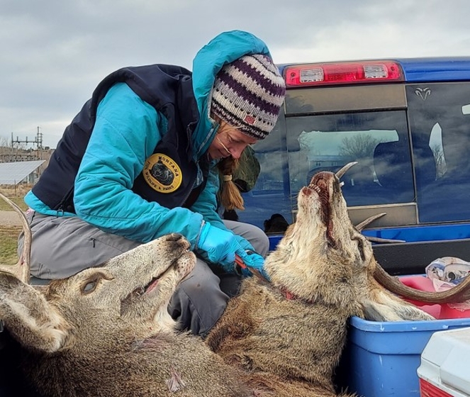 FWP Region 7 non-game biologist Brandi Skone collects a chronic wasting disease sample from a mule deer buck at the Ashland check station.