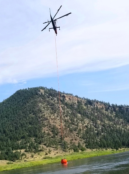 A helicopter dips water from the Missouri River in 2019