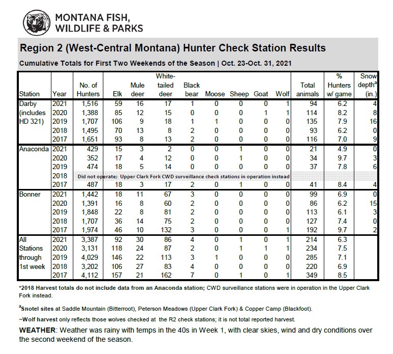 The number of hunter trips through the Darby, Bonner and Anaconda check stations totaled 3,387 for the first two weekends of the season, up eight percent from this point in the 2020 season. Those hunters checked enough deer to keep deer harvest on track with last year, while the 92 elk reported so far marks a five-year low.