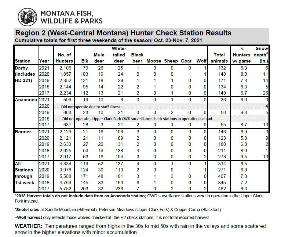 The number of hunter trips through the Darby, Bonner and Anaconda check stations totaled 4,834 for the first two weekends of the season, up from 3,978 in the 2020 season. Those hunters checked enough deer to put harvest above last year’s mid-point, while the running total of 119 elk is just slightly behind the 124 recorded last season at the point.