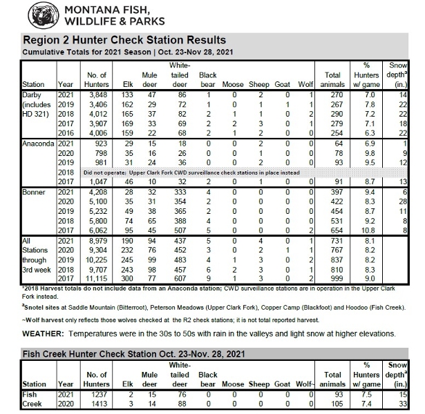 In the six weekends of the season, Montana Fish, Wildlife & Parks operated wildlife check stations in four locations around west-central Montana, where biologists recorded 10,216 hunter stops and a harvest of 192 elk, 109 mule deer and 513 white-tailed deer. This compares to 10,717 hunter stops, 235 elk, 90 mule deer and 540 white-tailed deer in the 2020 season.