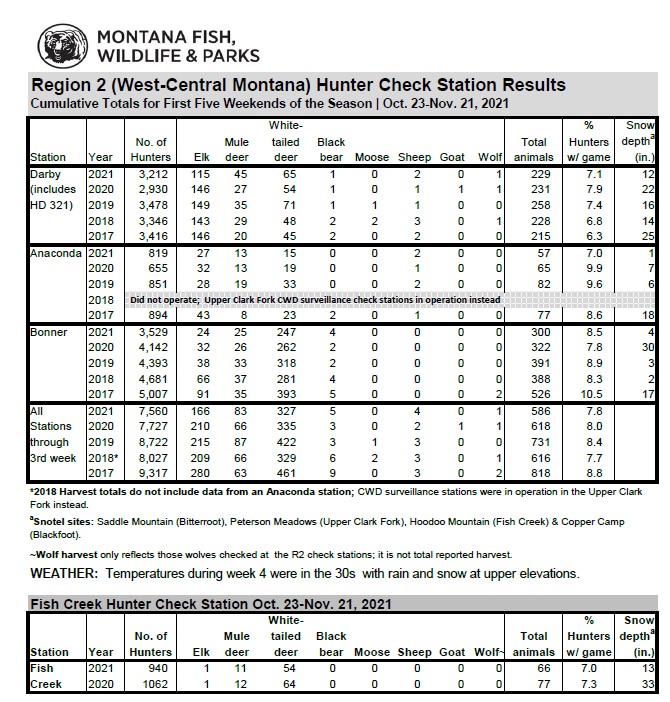 Overall, the four Montana Fish, Wildlife & Parks hunter check stations in west-central Montana are reporting 8,500 hunter trips, 167 elk, 94 mule deer and 381 white-tailed deer compared to 8,789 hunter trips, 211 elk, 88 mule deer and 399 white-tailed deer at this point in the 2020 season.
