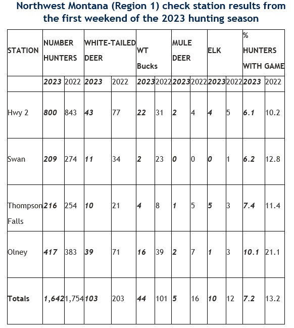 Northwest Montana game check station results from opening weekend of 2023 hunting season