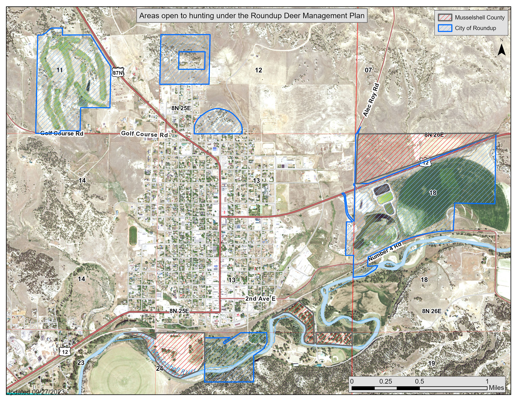 Hunting will take place on designated property owned by the City of Roundup and Musselshell County, as outlined in the map below.