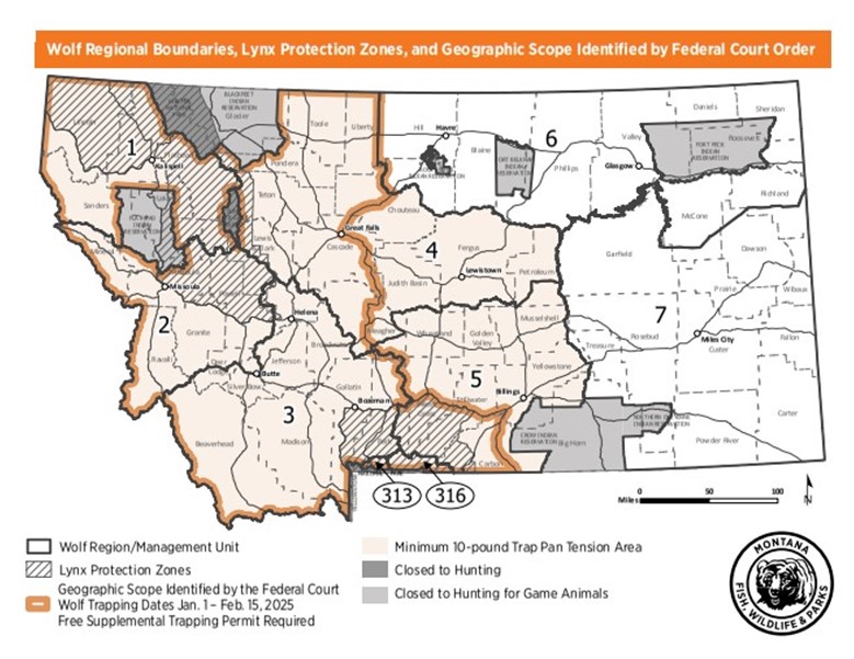 Wolf trapping also opens in part of Montana Dec. 2, except in areas where the harvest quotas have been met for the season. However, within a geographic area defined by a federal court order (see map), which covers all of western Montana, wolf trapping will be open Jan. 1 through Feb. 15, although quotas will also influence closures in these areas. Please see the 2024 Wolf and Furbearer Regulations for specific details.