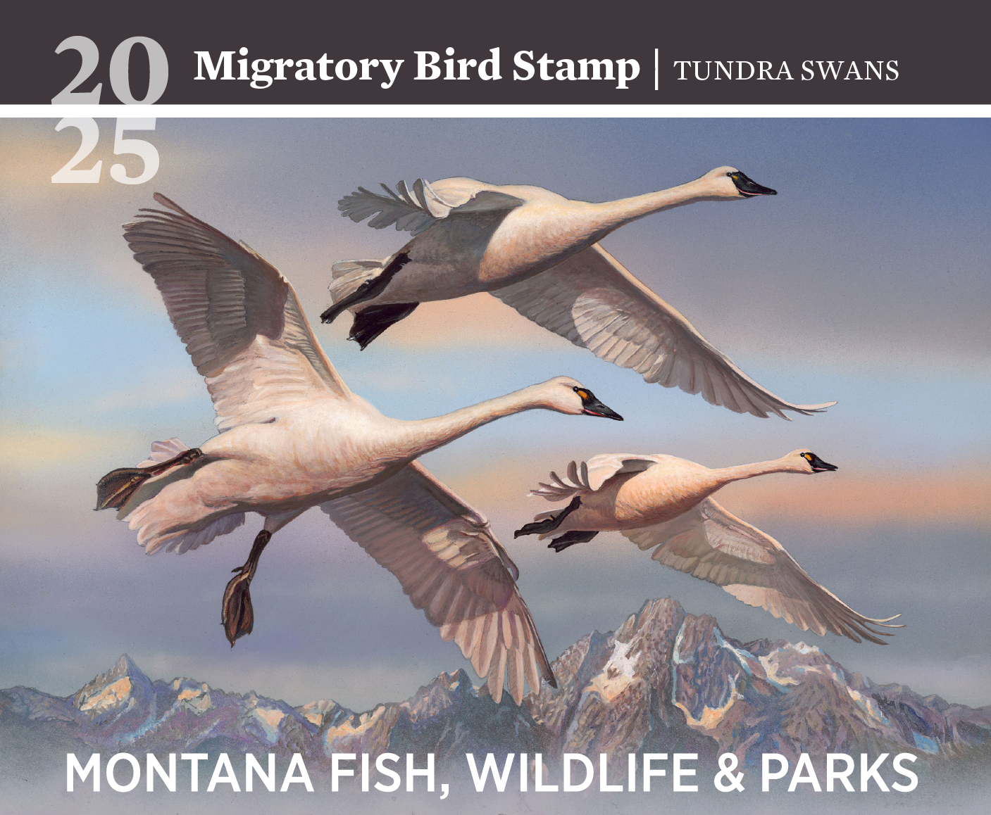 HELENA – A trio of tundra swans winging their way through a gray sky in the shadows of Rocky Mountain peaks is captured brilliantly in the 2025 Montana Migratory Bird Stamp.