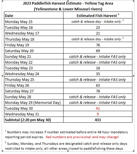 As of May 31st, at 1:00 pm the estimated paddlefish harvest is 433 fish. Fish are distributed throughout the Yellowstone River and are being caught between the State Line and Miles City.